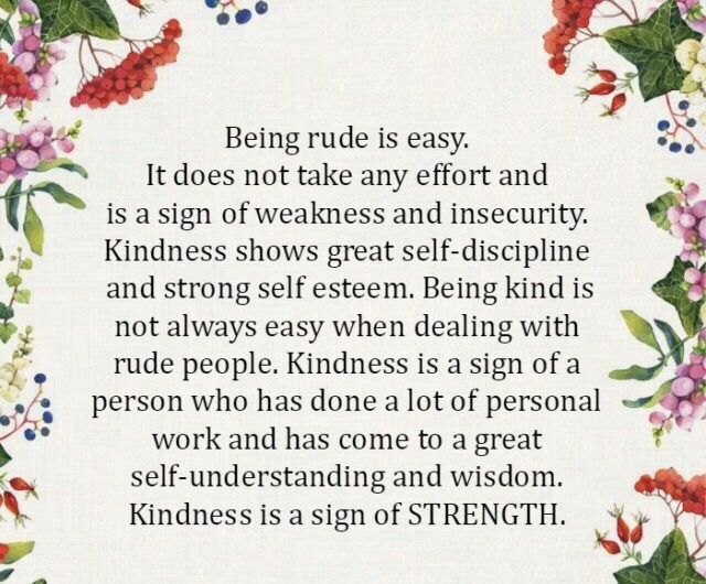 Being rude is easy. It does not take any effort and is a sign of weakness and insecurity. Kindness shows great self-discipline and strong self-esteem. Being kind is not always easy when dealing with rude people. Kindness is a sign of a person who has done a lot of personal work and has come to a great self-understanding and wisdom. Choose to be kind over being right and you’ll be right every time because kindness is a sign of STRENGTH.